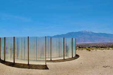 Now this next one took a short walk with the sun hitting our backs but the reward was worth it. 'To Breathe -- Coachella Valley' by Kimsooja. Known for her work with sculptures, paintings, film, performance, and installations, through this piece, the artist pulls from different branches of experience. Kimsooja describes this installation as a “bottari of light," as mentioned on the Desert X website. What makes this piece stand out is that the reflection and light changes with the sun's schedule. It felt like stepping into a portal.